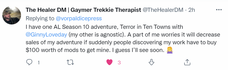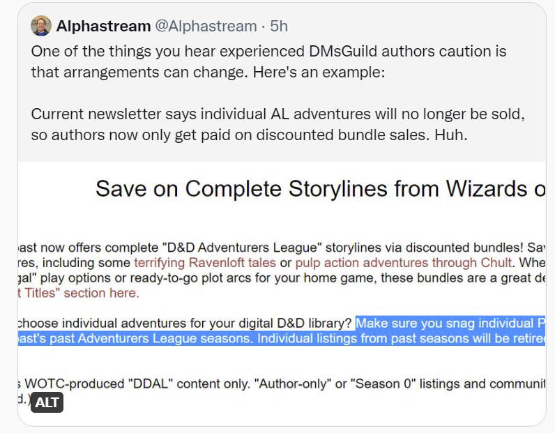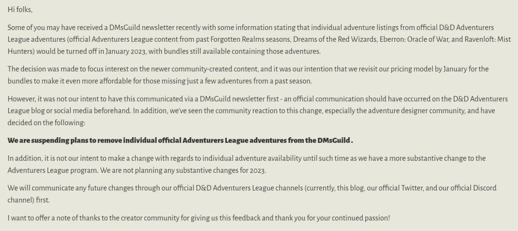 HOWEVER. @DnD_AdvLeague is walking back the decision to remove individual listings for official AL content. And we also got a mea culpa for how the (lack of) notification was handled, so that’s something.
